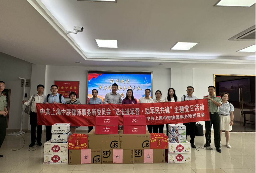 为庆祝建军节97周年,7月31日,中共上海中联律师事务所委员会(以下简称“中联党委”)前往武警上海总队执勤四队十中队开展主题党日活动,签订共建协议,慰问武警部队官兵。中联党委副书记沈荣华、青年委员聂东旭、学习委员李景良、第五党支部副书记丁钰及部分党员参加此次活动。参观结束后,中联党委为武警上海总队执勤四队十中队送去慰问品,中队指导员杨磊同志对我们的到来表示感谢,双方签订了军地共建协议书,后续将进一步开展相关工作。