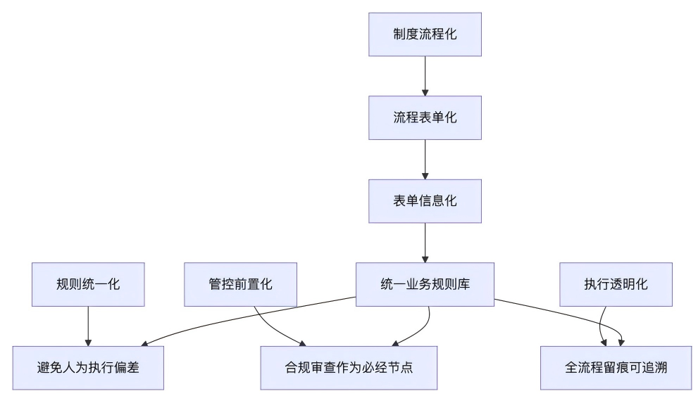 信息系统的核心价值在于通过数字化手段实现"制度流程化、流程表单化、表单信息化",将分散的管理要求整合为统一的业务规则库。具体而言: