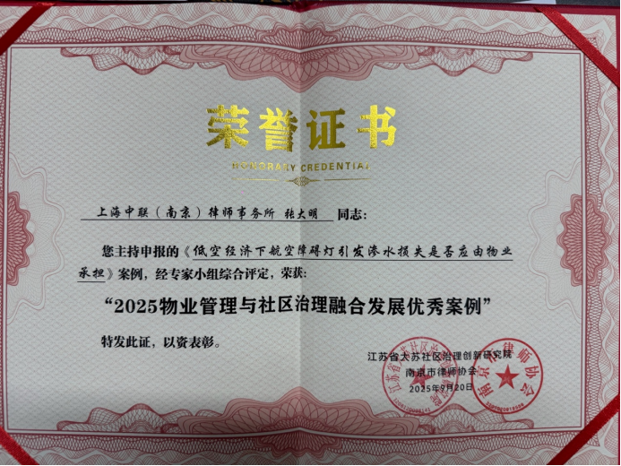 上海中联(南京)律师事务所张大明律师承办的《低空经济下航空障碍灯引发渗水损失是否应由物业承担》一案,经专家小组综合评定,荣获“2025物业管理与社会治理融合发展优秀案例”。