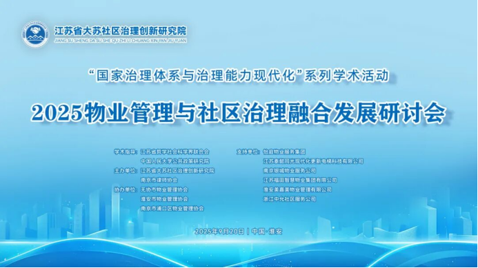 2025年9月20日,由江苏省哲学社会科学界联合会、中国人民大学公共政策研究院指导,江苏省大苏社区治理创新研究院、南京市律师协会联合主办的“2025物业管理与社会治理融合发展研讨会”在淮安成功举办。