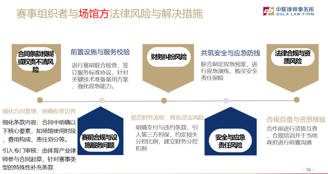 李岩律师还针对体育赛事领域提出了全流程的法律服务产品设想,贯穿赛事的申办、筹备、举办及赛后四大阶段,旨在为赛事组织者及相关主体提供系统性的法律保障。法律服务产品涵盖从程序审批、合同审查、风险管控到全程监督与赛后维权等各个环节,并特别针对安全应急、财务纠纷、税务合规、商业权益保护等核心风险点,制定包括资质核验、合同强化、预案制定、熔断机制在内的具体防控措施,展现出中联律师事务所在体育赛事领域专业化、模块化与精细化的法律服务特色。
