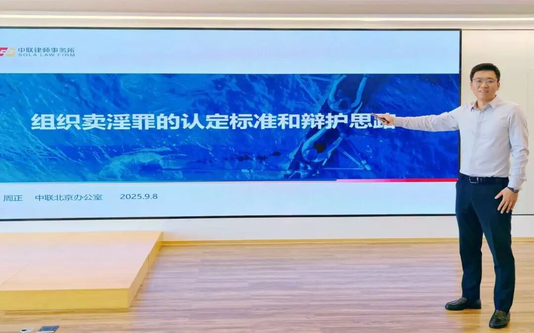 2025年9月8日上午9:00,中联北京办公室第三十九期周一晨会在鼎好大厦21层举行。中联北京办公室合伙人周正律师以《组织卖淫罪的认定标准和辩护思路》为主题做了分享。北京办公室和中联各地办公室同仁线下线上一起参与晨会分享。中联北京办公室刘紫儒律师主持了晨会。