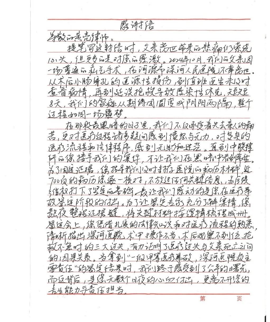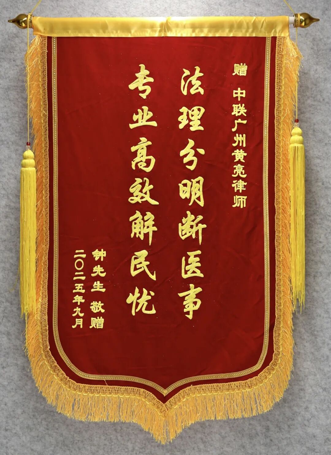 2025年9月21日,中联广州办公室合伙人黄亮律师获委托人赠送“法理分明断医案 专业高效解民忧”锦旗与亲笔感谢信,再次以专业、细致的服务水平,及良好的办案效果,获得委托人的高度赞誉。