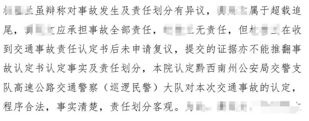 下图是我所黄一宸律师代理的一个交通事故案件,虽然法官从某种意义上认可了我方提出的,对方属超载追尾应当承担事故的全部责任,但是交警认定书没有认定这一事实,且没有及时的申请复核,最终法院仍未改变交警认定事故责任。