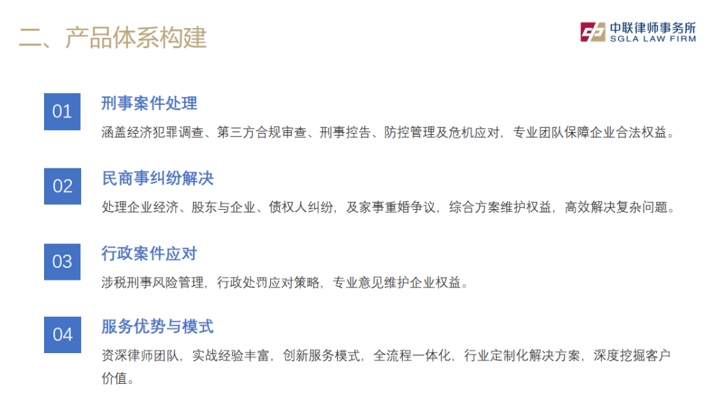 谢律师结合办案经验,强调要构建“刑事案件处理—民商事纠纷解决—行政案件应对”三位一体的产品服务体系。刑事案件处理涵盖企业内部舞弊调查、第三方合规审查、刑事控告、刑事风险防控及刑事危机应对。民商事纠纷解决聚焦企业经营中的复杂问题,包括经济纠纷、股东与企业纠纷、债权人纠纷及家事重婚争议。行政案件应对则重点关注涉税刑事风险管理、行政处罚合法性审查,为企业提供从风险防控到争议解决的全流程行政法律服务。