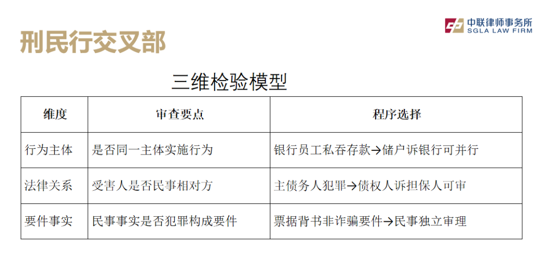 在分享中,谢律师认为,刑民行交叉业务既是满足市场综合性法律服务的需要,也是满足客户高品质律师服务的需要,属于新的业务领域,还面临着许多难题。实践中,刑民行交叉业务中普遍存在的“程序冲突、责任划分、合同效力”三大核心难题。