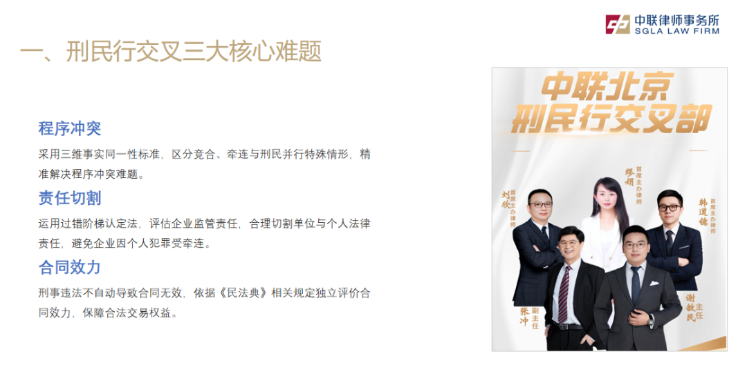 “刑民行交叉业务的本质,是穿透复杂风险、提供系统化解决方案。”中联北京刑民行交叉部将持续以“专业、敬业、高效、精准、全流程”为准则,融合法律与商业双重视角,为企业客户创造更大价值。