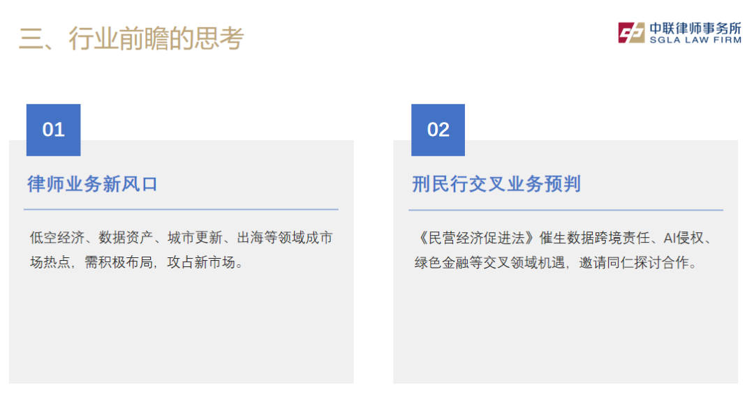 最后,谢律师提出“聚焦新兴领域+挖掘民营经济新需求”的双轮战略,在低空经济、数据资产、城市更新、企业出海等领域做好业务布局和专业能力提升,用高品质专业服务推动《民营经济促进法》的实施。
