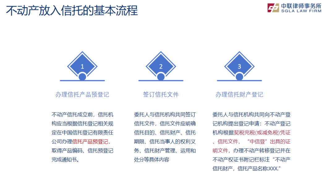 侯律师指出,不动产信托的基本流程包括办理信托产品预登记、签订信托文件、向“中信登”申请不动产确权函、不动产交易中心办理过户登记等。
