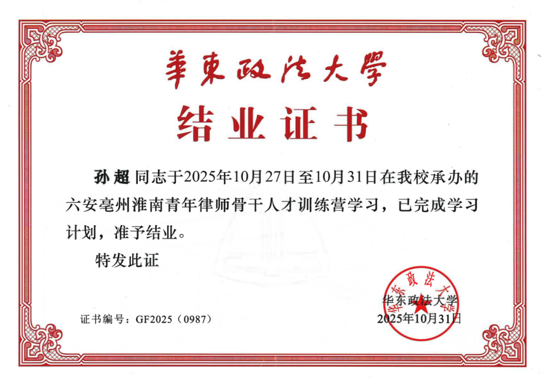 为深入贯彻习近平法治思想,提升青年律师专业素养与综合能力,2025年10月27日至31日,由六安市、亳州市、淮南市律师协会主办、华东政法大学承办的“六安亳州淮南青年骨干律师人才训练营”在沪举行。上海中联(兴义)律师事务所管委会副主任、高级合伙人孙超律师受邀参加,与来自安徽三地的约90名青年律师共同完成为期五天的密集研修,顺利结业并获颁结业证书。