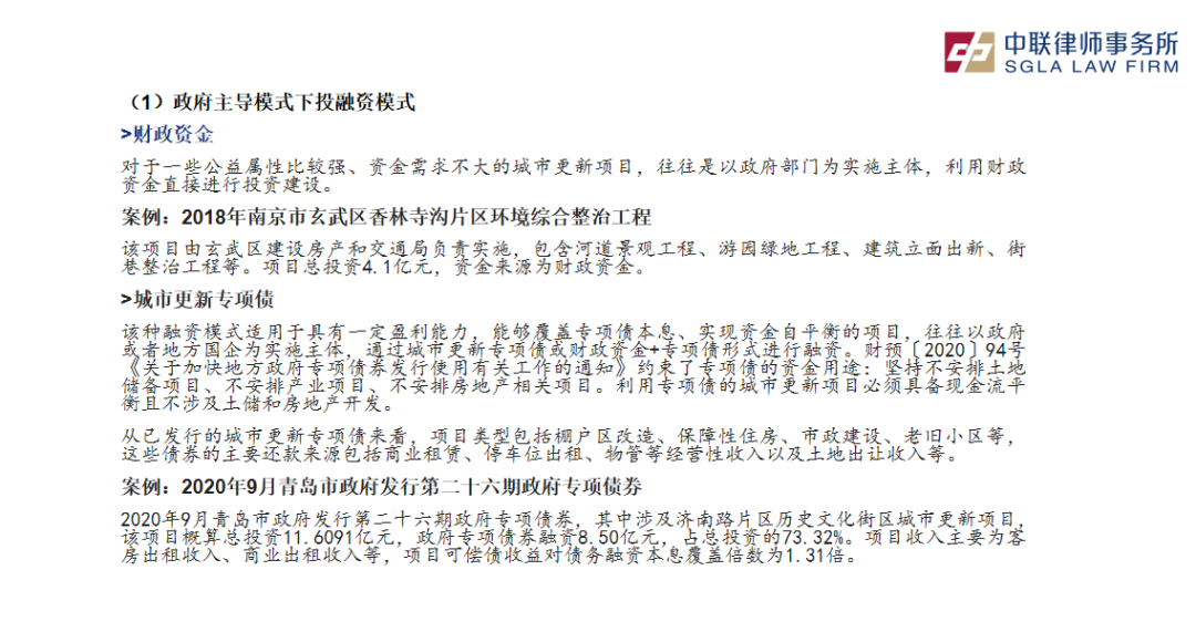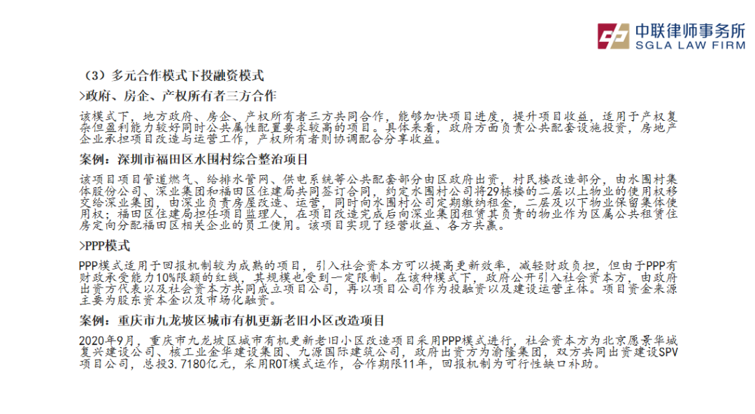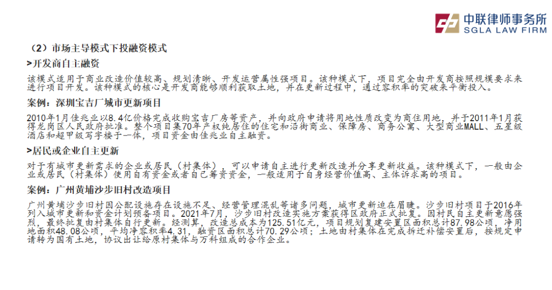 齐律师指出,城市更新业务的不同模式决定了各自独特的投融资途径: