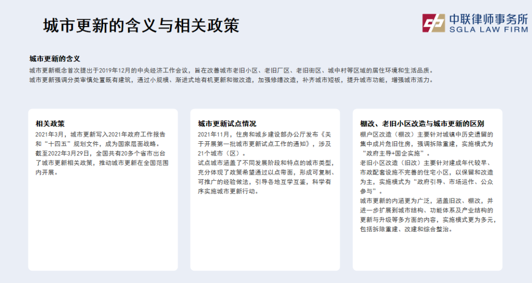 晨会上,齐律师首先介绍了城市更新的含义及其相关政策背景。2019年12月,中央经济工作会议首次提出城市更新概念,旨在改善老旧小区、厂区、街区和城中村的居住环境。2021年3月,城市更新被正式写入政府工作报告和“十四五”规划,成为国家战略。目前,全国已有20多个省市出台了相关政策,推动城市更新在全国范围内开展。