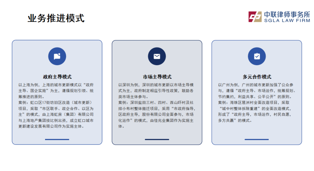 齐律师结合已经成功实施城市更新的案例,总结提出了城市更新的三种业务模式:一是政府主导模式。齐律师以上海虹口区17街坊旧区改造项目为例,该项目由市区联手、政企合作,以“政府主导、国企实施”为主,遵循规划引领、统筹推进的原则,通过定向挂牌、邀请招标等程序实现资金平衡。二是市场主导模式。深圳盐田三村整体搬迁项目采用市政府指导、区政府主导、股份有限公司全面参与的模式,由佳兆业集团作为实施主体,实现了高效的资金周转和快速回迁。三是多元合作模式。广州海珠区琶洲村全面改造项目采取“城中村整体拆除重建”模式,形成了“政府主导,市场运作,村民自愿,多方共赢”的局面,大幅提升了村集体及村民收入。