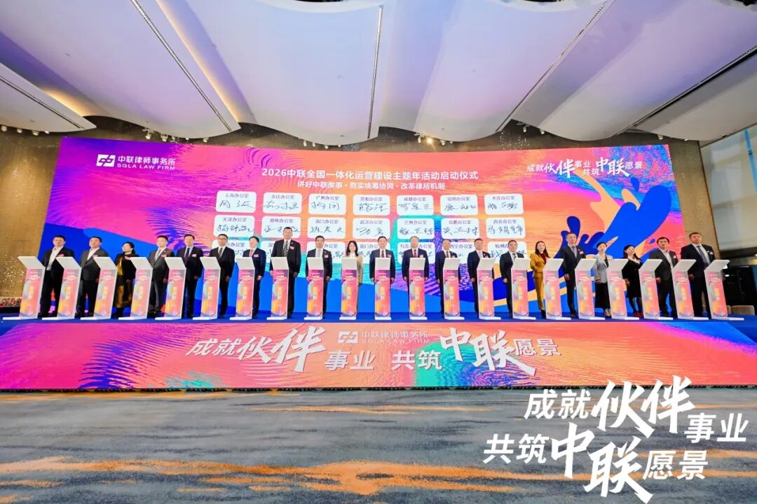 "卓耀双年 联创未来"迎来重要时刻——"2026中联全国一体化运营建设主题年活动"正式启动。在全体与会代表的共同见证下,周波律师与各区域办公室代表齐聚舞台,共同签下自己的姓名,开启了这一具有战略意义的年度主题活动,为中联未来的一体化运营建设与战略发展目标注入新的动力。