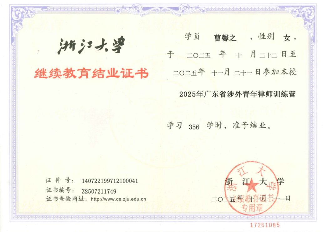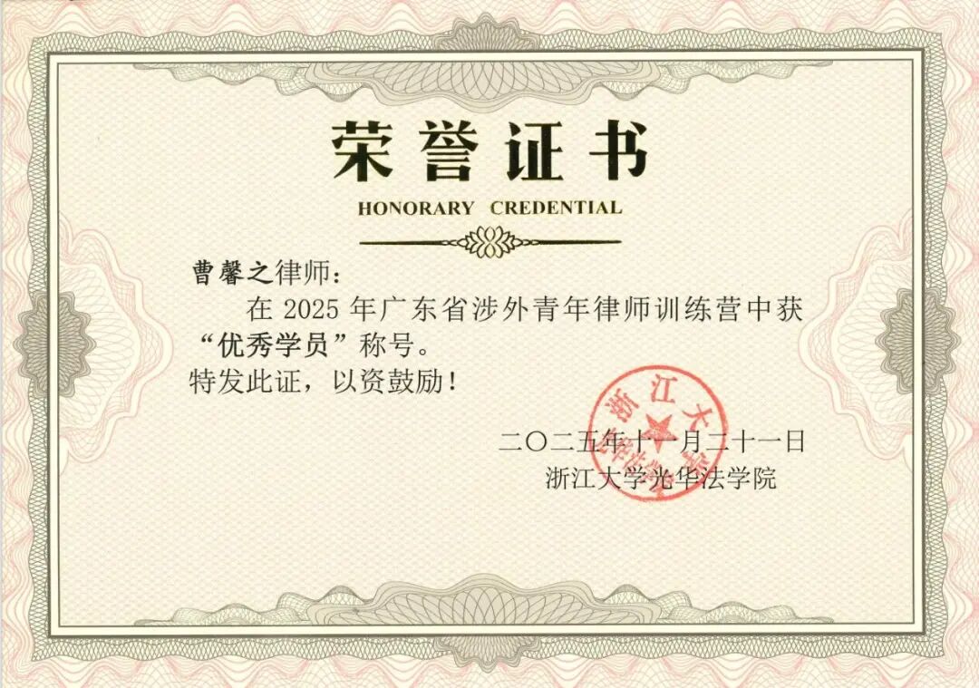 2025年10月23日至11月22日,由广东省司法厅、广东省律师协会主办,浙江大学承办的广东省涉外青年律师训练营在浙江大学光华法学院成功举办。作为全省首个为期30天的专项涉外律师培训,本次训练营吸引了来自全省的百余名律师参加。本所涉外律师曹馨之亦全程参与、认真学习,荣获“优秀学员”称号。