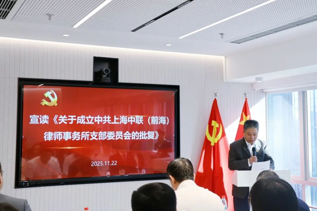 深圳市律师行业党委委员黄振辉同志现场宣读了上级党委《关于成立中共上海中联(前海)律师事务所支部委员会的批复》(深律宝党[2025]58号)。