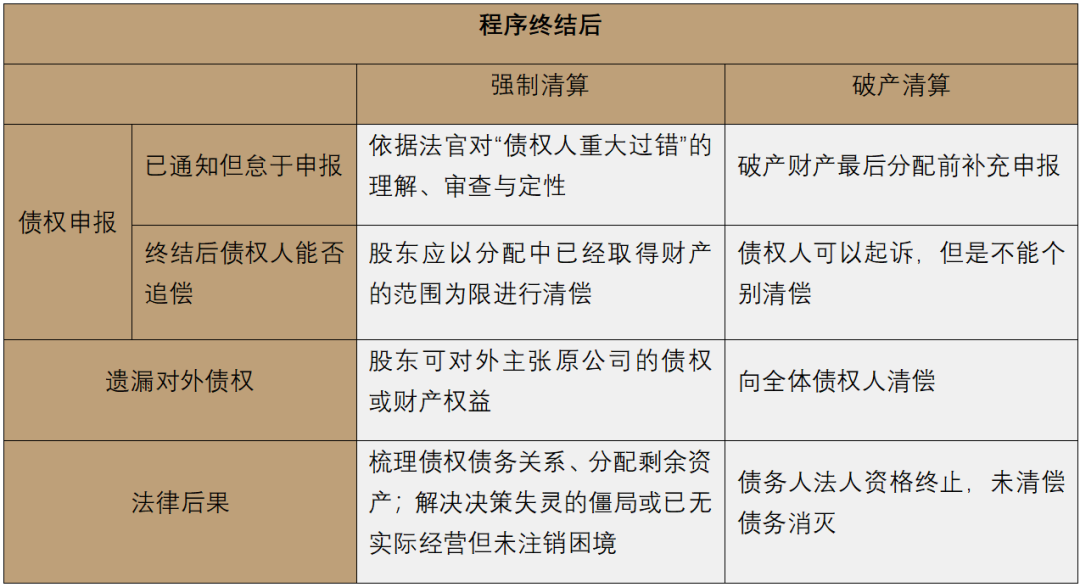 两种程序虽然都能起到保护债权人利益的作用,但其在法律后果上存在明显差异:强制清算是全面梳理主体现存债权债务关系、分配剩余资产,有时也被用以解决主体决策失灵的僵局或已无实际经营但未注销的困境;破产清算则以公平清偿债务、保障债权人权益为宗旨。若因股东、董事等怠于履行清算义务(如隐匿账册、转移财产)致使无法清算的,债权人可要求其连带清偿债务;且控股股东需自证无剩余财产,否则推定其承担赔偿责任。而破产清算终结后,原则上债务人法人资格终止,未清偿债务消灭。如破产程序终结之日起二年内,破产人有可供分配财产的,债权人可以请求人民法院进行追加分配。