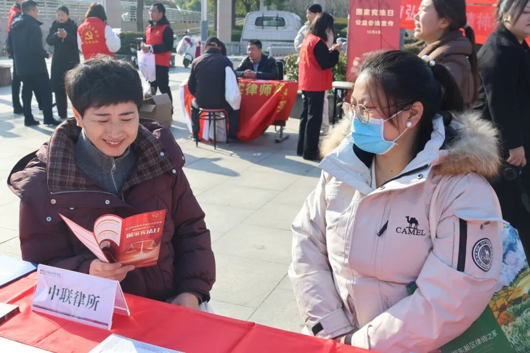 为深入贯彻习近平法治思想,推动宪法精神深入社区、扎根基层,郑东新区律工委于2025年12月4日上午在郑州市图书馆广场开展集中宣传活动。中联郑州办公室积极响应号召,合伙人赵卫萍律师、梁妍律师,以及青年律师万嘉诚、翟曼雅、侯怡清、张嘉凡、鲁佳依至现场开展普法宣传,以专业力量助力法治社会建设。