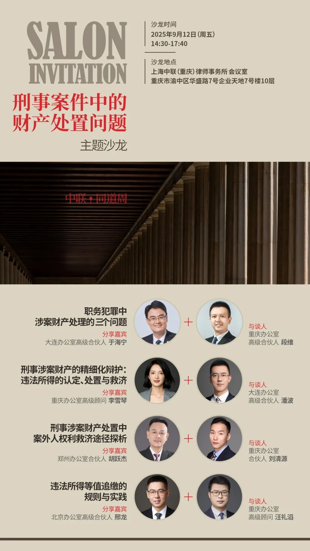 9月8日-12日,大连与重庆、郑州、北京四地办公室联合主办第二期“同道周”,聚焦“刑事案件中的财产处置问题”,中联四地办公室携手呈现4篇专业论述、12条观点辑要、1场专题沙龙、2期“观察”短片,多角度、重实务、有温度的深度表达,致力为中联客户提供更具持续性和专业度的创新服务。