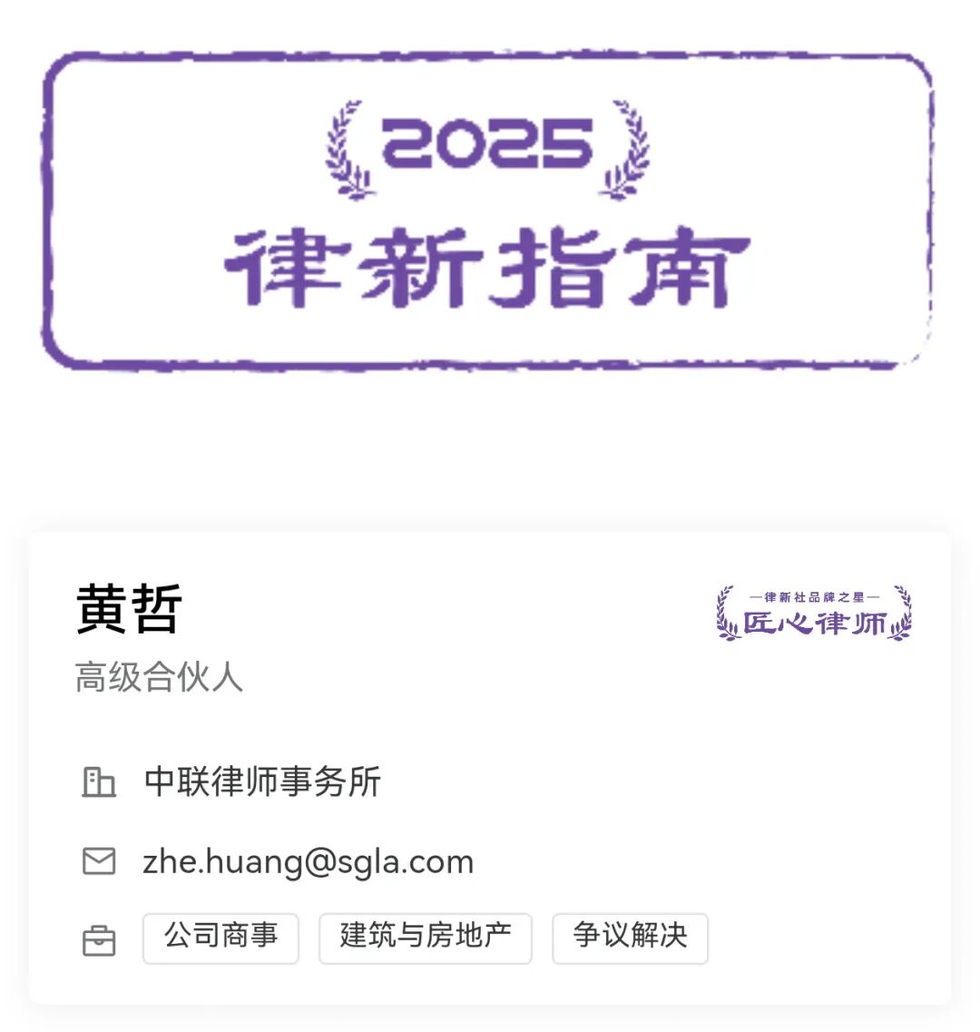 12月28日,法律服务业权威媒体“律新社”发布《精品法律服务品牌指南(2025):企业商事领域》,本所合伙人黄哲律师凭借卓越的专业能力、深厚的行业口碑与持续的品牌影响力,荣获“律新社2025年度企业商事领域品牌之星:匠心律师”;合伙人孙庭超律师亦凭借出色的业务表现、创新的法律服务方案以及持续积累的行业声誉,荣获“律新社2025年度企业商事领域品牌之星:新锐律师”。